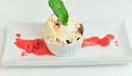 Mi-cuit aux Caramilk servi avec crème glacée maison à l’Amarula et coulis de framboises.
